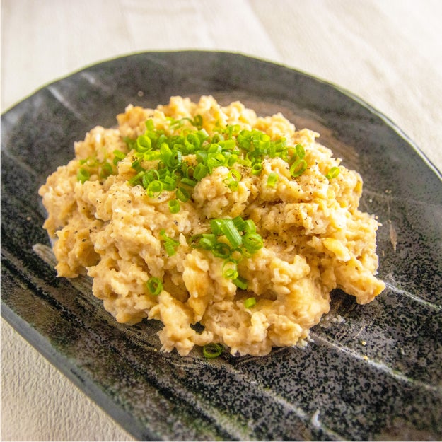 「長芋ふわとろスクランブルエッグ」は、長芋のやわらかなとろみが卵とよくなじみ、軽い口当たりなのにしっかり満足できる一皿です。卵だけで作るスクランブルとは少し違う、ふんわりとしたやさしい食感が楽しめます。しょうゆをほんの少し加えることで味が落ち着き、バターの香りがふわっと広がって、どこかほっとする風味になります。朝ごはんにも合いますし、夜に少しだけ温かいものを食べたいときにも寄り添ってくれる料理です。長芋が入ることで自然とボリュームが出て、無理なく満足感が得られるのもうれしいところ。仕上げの黒コショウと小ねぎが彩りと香りを添え、最後までやさしい味わいのまま楽しめますよ!